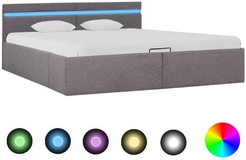 Ágykeret: Színe: tópszínű Anyaga: szövetkárpit + furnérlemez ágyrács + acél és MDF ágykeret Teljes mérete: 211 x 188 x 73 cm (Ho x Szé x Ma) Alkalmas matrac mérete: 180 x 200 cm (Ho x Szé) (a szállítás matracot nem tartalmaz) Tárolórekesszel ellátva Könnyen használható hidraulikus gázemelő mechanizmus LED-szalag: Hosszúság: 180 cm Teljesítmény: 7,2 W 24 gombos távi
