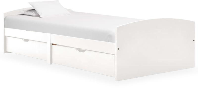Ez a fiókos fa ágykeret praktikus és dekoratív kiegészítője lesz bármely hálószobának. Ez a tömör fenyőfából készült ágykeret rendkívül masszív és tartós. A masszív lécek biztosítják a szükséges támaszt, és nagyon kényelmesek is. A mellékelt két ágyfiók bőséges helyet biztosít az összehajtott ruhák, játékok stb. tárolásához, és ezáltal szobája tisz