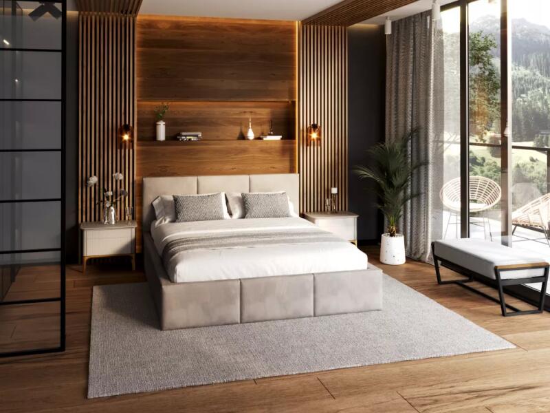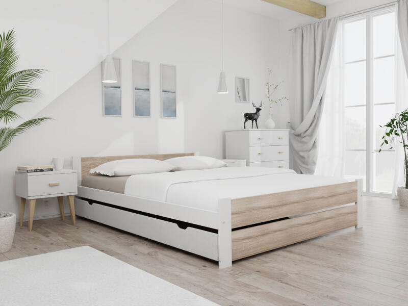 Az IKAROS DOUBLE ágy a modern dizájn és a funkcionalitás tökéletes kombinációja , amely nagy hangsúlyt fektet a stílusos részletekre. Szerkezete kiváló minőségű bútorkészítésre alkalmas forgácslapból készült , amely biztosítja a stabilitást és a hosszú élettartamot. Az elegáns lábak tömör fenyőből készültek, ami természetes megjelenést és szilárdságot ad a