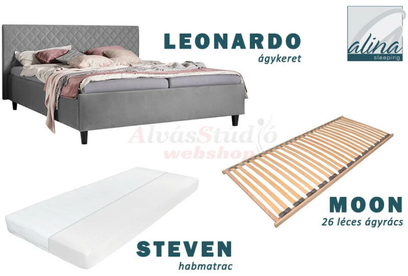 Leonardo modern kárpitozott szövet ágy szett Steven habmatraccal, Moon rugalmas ágyráccsal és fa lábakkal a harmonikus hálószoba kialakítására. A szövetborítású ágykeret egyszerű letisztult dizájnja, kényelmet és eleganciát kölcsönöz hálószobának. Kiválóan kombinálható más bútorokkal és modern hangulatot áraszt közvetlenül a hálószobába. ol. circle-numb, ol