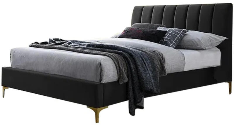 A MIRAGE fekete kárpitozott franciaágy 160x200 cm tökéletes választás a modern hálószobákba. A fekete és az arany szín kombinációja nagyon luxusos és elegáns hatást kelt. Úgy tervezték, hogy a lehető legkényelmesebb pihenést biztosítsa. A franciaágy magas kárpitozott háttámlával rendelkezik, amely még szebbé teszi az egész ágyat. Az ágytámla ráadásul nem csak gy