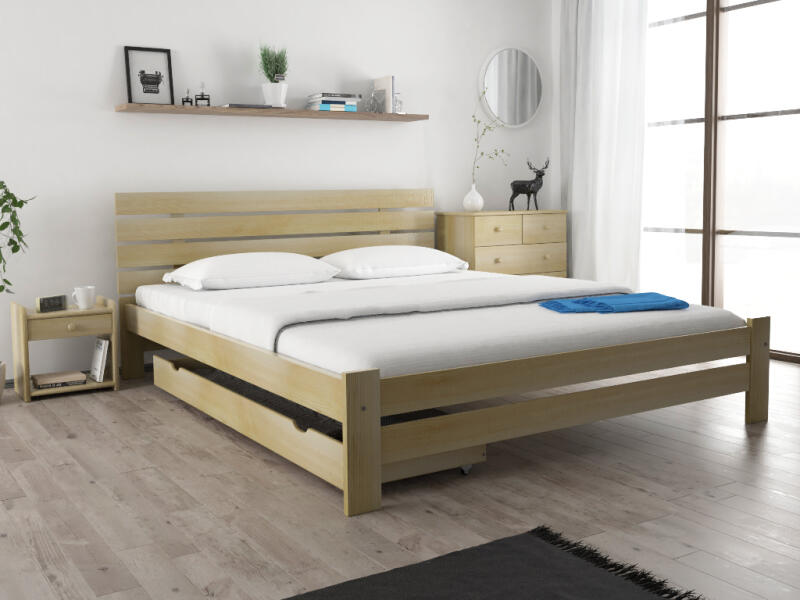 Tömör fenyőből készült termék. A matracot, ágyrácsot és az ágyneműtartó fiókot az ár NEM tartalmazza. Figyelemfelkeltő, elegáns és egyben nagyon stabil. Lapraszerelt A váz natúr tömör fenyőfából készült kiváló minőségben. A modern és praktikus kialakítás elegánssá és strapabíróvá teszi az ágyat. Az kétszemélyes kivitelű ágyak aljában végigfut a fejtá