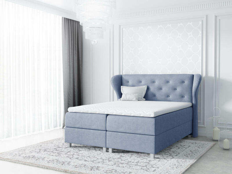 Kárpitozott kontinentális franciaágy, 2 db, rugós rásegítéssel kétoldalra nyíló, öblös ágyneműtartóval. Minőségi táskarugós ágybetét, 5 cm magas, nagy rugalmasságú szivacs fedőmatrac. Választható kárpitok Madryt - ekobőrJasmine - kötött szövetRiviera – bársonyJaguar – bársony
