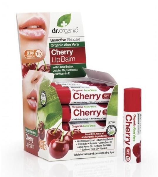 Dr. Organic Ajakbalzsam bioaktív Aloe verával és cseresznyével, 5,7 ml- Hidratál, megnyugtat és táplál - Biogazdálkodásból származó és természetes összetevőkkel - 15-ös UVA és UVB fényvédő faktorral - Az összetevők minimum 70%-a biogazdálkodásból származik**Kivétel a víz és a só. Kiszerelés: 5,7 ml