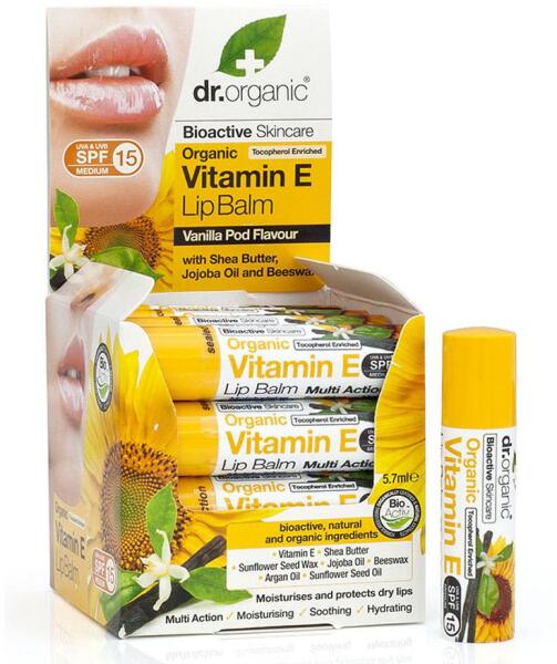 Dr. Organic Bio E-Vitaminos ajakbalzsam, 5,7 ml - A bioaktív tokoferolok (E-vitamin vegyületek) természetes keveréke, mely válogatott növényi kivonatokkal kiegészítve a legszárazabb bőrszövet rétegei közé is képes behatolni és azonnali hidratációt biztosít - 15-ös fényvédő faktora véd a káros UVA és UVB sugarak ellen - Az összetevők természetes eredete miatt a szín
