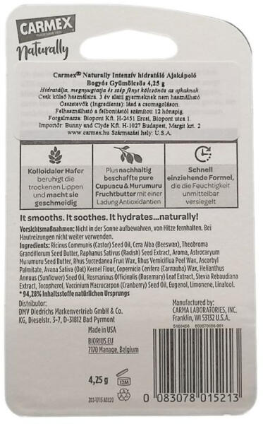 Az eper és különböző természetes vajak gazdag keveréke. Táplálja és hidratálja az ajkait, puhán és rugalmasan tartja azokat. Fényes csillogást ad, így biztosítva ajkainak a természetesen egészséges megjelenést. Nem tartalmaz mesterséges színezékeket. Használata: Szükség esetén kenje be ajkait!
