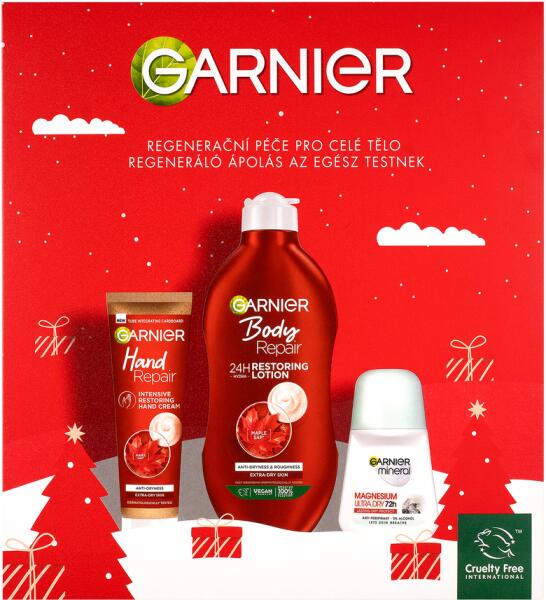 A Garnier karácsonyra egy átfogó testápolási ajándékcsomaggal segít meglepni a szeretteid. Prémium regeneráló csomagunk Magnesium Ultra Dry dezodort, intenzíven tápláló testápolót és regeneráló kézkrémet tartalmaz a bőr regenerálásáért a hideg téli időben. Csomag tartalma: Garnier Repairing Care testápoló tej extra száraz bőrre, 400 ml Garnier Intenzív regener