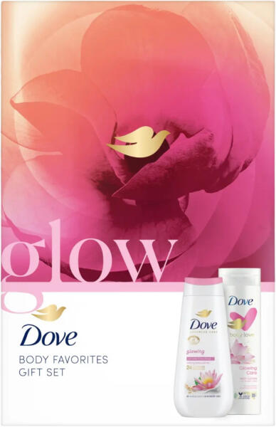 DOVE Glow tus&testápoló ajándékcsomag. A csomag tartalma: DOVE testápoló 250ml Glowing Care, Dove Glowing krémtusfürdő 225ml Ragyogj a Dove Glow ajándékcsomaggal! A rózsavíz és lótuszvirág illatú Dove Glowing krémtusfürdő bársonyos és puha bőrt eredményez, egyből zuhanyzás után. A Glowing Care testápoló pedig a fokozott hidratálásról gondoskodik, hogy a te bőr