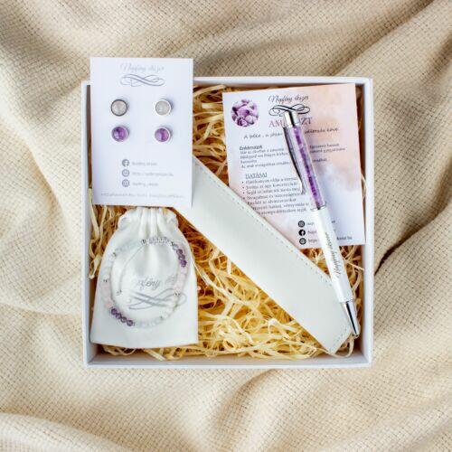 A rózsakvarc-ametiszt ajándékbox kiváló ajándék lehet minden olyan nő számára, aki értékeli a finom és elegáns ékszereket. A boxban található egy , rózsakvarc-ametiszt-holdkő ásvány karkötő, 2 pár ásvány fülbevaló és egy ametiszt ásvány golyóstoll. Az ajándékboxok szatén szalaggal vannak átkötve, így ajándékozás pillanata is egy varázslatos élmény lesz.