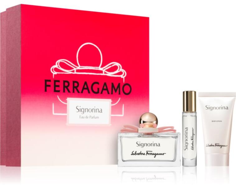 Ferragamo Signorina, , Női szettek nőknek, Támogassa kedvenc illatának intenzitását. A női Ferragamo Signorina parfüm-szett magán az illaton kívül még ápoló kozmetikumokat is tartalmaz, melyek meghosszabbítják érzéki élményét. A szett tartalma:Eau de Parfum 100 ml utazó csomag 10 ml testápoló tej 50 ml