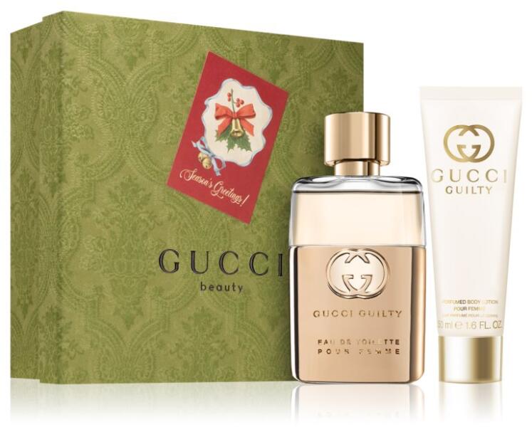 A luxusillat mindig az igazi választás lesz, amikor igazi örömöt akar szerezni. A szép csomagolású női Gucci Guilty Pour Femme parfüm-szett megduplázza a megajándékozott örömét. Higgyen a tökéletesen összehangolt szett varázsában, amelybe minden nő az első látásra beleszeret. Tulajdonságok: ajándéknak kiváló minden nőnek örömöt szerez ajándéktipp, mely garantál