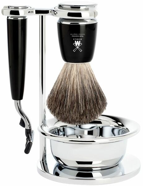 A modern Mühle RYTMO termékcsalád teljes borotválkozószettje. Négy darabos készlet, háromszorosan polírozott, fekete színű műgyantából készült fogantyúkkal. A borotvaecset borz sörtékkel van ellátva, tiszta borz minőségben. A borz sörték a legalapvetőbbek, azaz a legkeményebbek a borz sörték kategóriájában, de még mindig kellemesen rugalmas sörték, amelyek szappan