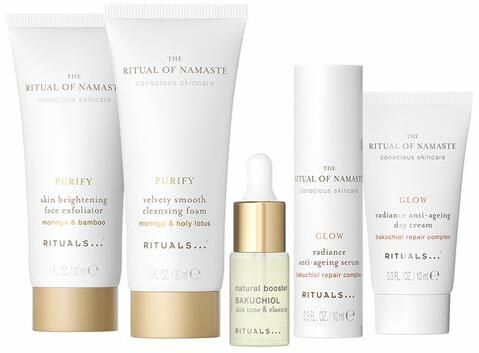 A szett tartalma: Arctisztító hab The Ritual of Namaste (Velvety Smooth Cleansing Foam) 30 ml Világosító bőrradír The Ritual of Namaste (Skin Brightening Face Exfoliator) 30 ml Világosító arcszérum öregedésgátló hatással Rituals The Ritual of Namaste (Radiance Anti-Aging Serum) 10 ml Bőrvilágosító nappali krém The Ritual of Namaste (Radiance Anti-aging Day Cream) 10 ml Arc boo