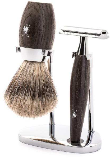Az elegánsan ergonomikus Mühle Kosmo termékcsalád teljes borotválkozószettje. Három darabból álló készlet, amelynek fogantyúja egy igazán ritka anyagból készült - olyan tölgyfából, amely néhány évszázadon át egy tőzeglápban feküdt. Miután kihúzták, több réteg olajjal kezelték, ami bársonyos matt árnyalatot adott neki. Tartalmazza: Krómozott állvány Borotválko