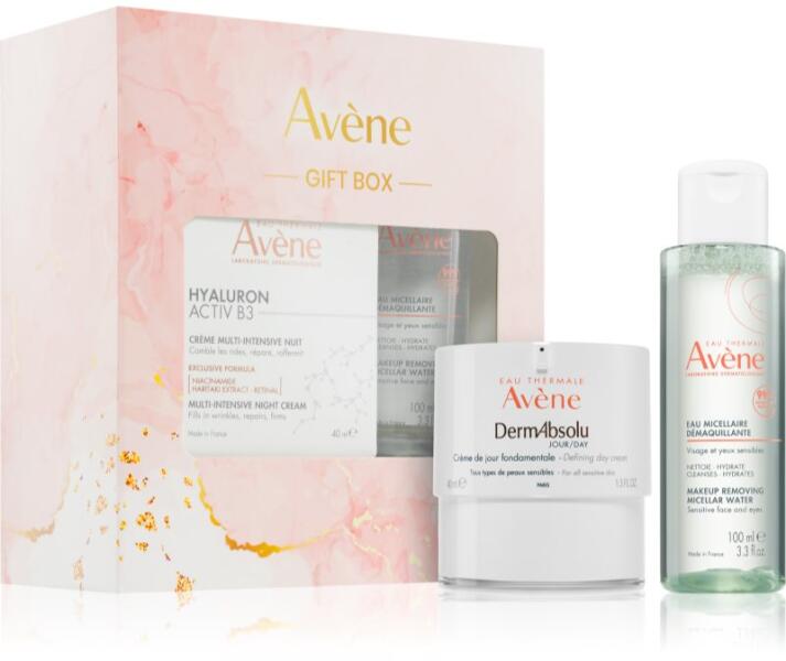 Avène Hyaluron Activ B3 Gift Set, db, Kozmetika szettek unisex, Minden egy csomagban, amire a szép megjelenésű arcbőrre szükség lehet. A kiváló Avène Hyaluron Activ B3 kozmetikai készlet önnek, és ajándékként a szeretteinek is örömet szerez. A szett tartalma:Avène Hyaluron Activ B3 intenzív éjszakai krém a ráncok ellen 40 ml Avène Eau Micellare micellás sminklemosó víz 1