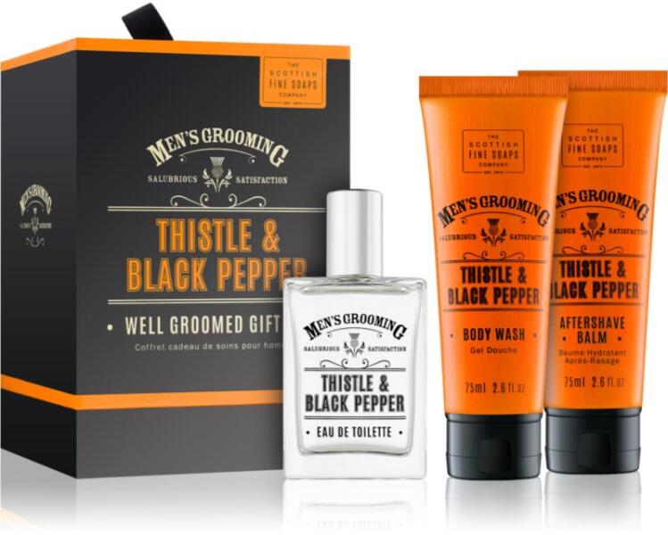 Scottish Fine Soaps Men’s Grooming Thistle & Black Pepper, , Férfi-testápolási szettek férfiaknak, Szerezzen örömöt a férfi testápoló készítményekkel teli Scottish Fine SoapsMen’s Grooming kozmetikai készlettel. Minden külsejére adó modern férfi örül neki. A szett tartalma: tusfürdő gél 75 ml borotválkozás utáni balzsam 75 ml Eau de Toilette 50 mlTulajdonságok: m