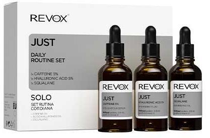 REVOX JUST NAPI RUTIN SZETT 1x KOFFEIN 5% 1x HIALURONSAV 5% 1x SZKVALÉN Alkalmazás: 1. LÉPÉSReggeli energia. Miután gyengéden megtisztítottuk arcbőrünket adjunk a szemkörnyéknek egy kis energiát a JUST 5%-os koffeinnel. Reggel 4-5 cseppet vigyünk fel finom tapogató mozdulatokkal a szem körüli megtisztított és teljesen száraz bőrre. A következő termék alkalmazása előtt vár
