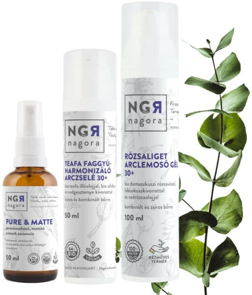 100% natúr, 3 lépéses faggyú-harmonizáló, arcápoló csomag a tinikori zsíros, pattanásos, mitesszeres bőr tisztítására és mattítására, kinézetének javítására , nappali és esti használatra. Tengeri algás kímélő arclemosó niacinamiddal, bio hibiszkusszal + pórusösszehúzó, mattító arctonik esszencia + szuperkönnyű bőrvédő arczselé teafa illóolajjal. SLS-, SLE