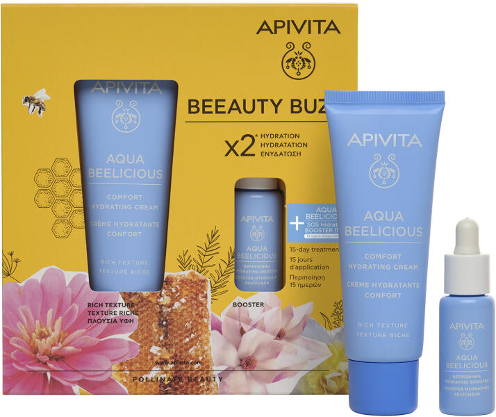 Apivita Aqua Beelicious hidratáló SOS booster: Azonnal és intenzíven hidratál, feltölt, véd a környezeti szennyezőktől és a korai bőröregedéstől. Virág és méz kivonatokkal Ez az összetett hatású water-gél booster a bodorrózsa, vadrózsa és írisz virágzat, méz kivonat, szabadalmaztatott propolisz kivonat, és a csipkebogyó infuzum tartalmának köszönhetően újratölti