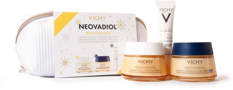 A csomag tartalma: 50ml - Menopause feltöltő lifting nappali krém, 50ml - Menopause éjszakai krém 15ml - Capital Soleil Uv age daily Termékismertető: A Neovadiol Menopause karácsonyi csomag termékei táplálják az érett arcbőrt miközben ragyogóbb, tónusosabb megjelenést kölcsönöznek neki. A neszeszer tartalmaz egy Menopause feltöltő lifting nappali 50 ml nappali arckrémet és