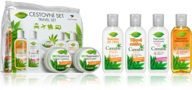 Bione Cosmetics Cannabis, , Kozmetika szettek nőknek, A szett tartalma: regeneráló sampon hajra 80 ml regeneráló kondicionáló hajra 80 ml hidratáló testápoló tej 80 ml hidratáló krém kézre 80 ml növényi vazelin 25 ml regeneráló arckrém 25 ml Tulajdonságok: ideális az utazáshoz miniatűr kiszerelésű termékeket tartalmaz mindennapi használatra való kozmetikai termék-öss