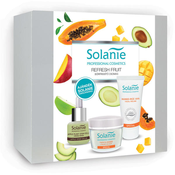 Repítsd érzékeid a trópusokra és fiatalítsd meg bőröd a Solanie Refresh Fruit bőrfrissítő Beauty csomagjával. A hármas hatásra épülő hámlasztó, aktiváló és bőrmegújító programmal hatékonyan aktiválhatod energiahiányos, megfáradt arcbőrödet, hogy az újból fiatalos fényében tündökölhessen. A különleges bőrfrissítő és bőraktiváló hatást a Mangó-Rizs A
