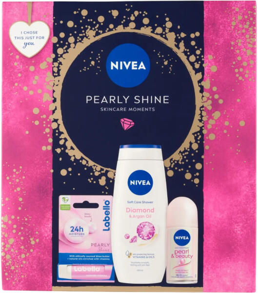 A NIVEA pearly shine ajándékcsomag. A csomag tartalma: Pearl & Beauty golyós dezodor 50ml, Diamond & Argan Oil krémtusfürdő 250ml, Labello Pearly Shine ajakápoló Pearl & Beauty izzadásgátló golyós dezodor lágy, rendkívül nőies illatú izzadásgátló gyöngykivonat-tartalommal, mely hatékony védelmet nyújt az izzadság ellen ugyanakkor a bőrhöz is gyengéd. A lágy