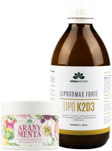 A csomag tartalma: Liposomax Forte Lipo- K2-D3 300ml Arany Menta Kézápoló Balzsam 100 ml Forradalmian új módszer a vitaminpótlásra! A liposzómás technológiával előállított táplálék kiegészítőkben található összetevők szinte azonnal bekerülnek a véráramba, és onnan a hatóanyag tartalom közvetlenül, majdhogynem hiánytalanul jut el a sejtekhez. A HerbaDoctor K2-D3 term