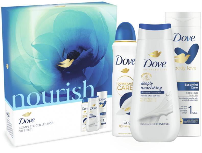 Kényeztesd magad vagy szeretteid a Dove Nourish ajándékcsomaggal. A Dove Deeply Nourishing krémtusfürdő akár 24 órán át tartó bársonyos és puha bőrt eredményez, egyből zuhanyzás után. A csomagban rejlő Esssential Care testápoló krémes formulájával a fokozott hidratálásról gondoskodik, míg a Dove Original izzadásgátló egész napos friss érzést biztosít.