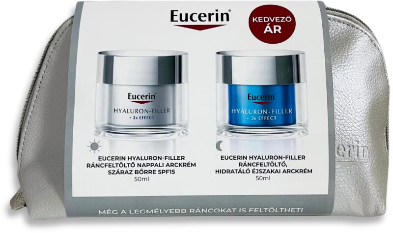 Eucerin Hyaluron-Filler + 3x effect ráncfeltöltő nappali arckrém száraz bőrre 50ml:Az Eucerin Hyaluron-Filler ráncfeltöltő nappali arckrém száraz bőrre hialuronsavat és szaponint tartalmaz. Rendszeres használattal jelentősen csökkenthető a homlok, a száj és az orr környéki ráncok mélysége. 15-ös fényvédő faktora segít csökkenteni a napsugárzás bőrkárosító hatás