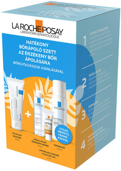 A csomag tartalma: - 1 db Cicaplast balzsam 40 ml - 1 db Micellás víz érzékeny bőrre 50 ml - 1 db Anthelios UVMUNE Fluid SPF 50+ 3 ml - 1 db Termálvíz 50 ml Márka: La Roche-Posay Lejárat: 2026.04. 30.