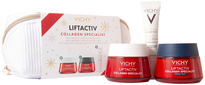VICHY Liftactiv Collagen Specialist Neszesszer Csomag 2X50ML: Csomag tartalma: Liftactiv Collagen Specialist Nappali arckrém 50ml Liftactiv Collagen Specialist Éjszakai arckrém 50ml VICHY LIFTACTIV COLLAGEN SPECIALIST KRÉM NAPPALI 50ML A Vichy Collagen Specialist krém egy új továbbfejlesztett formulája most háromszor több pro-kollagén peptidet tartalmaz. Ezt a krémet azoknak a nőknek