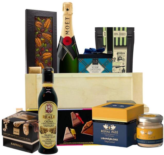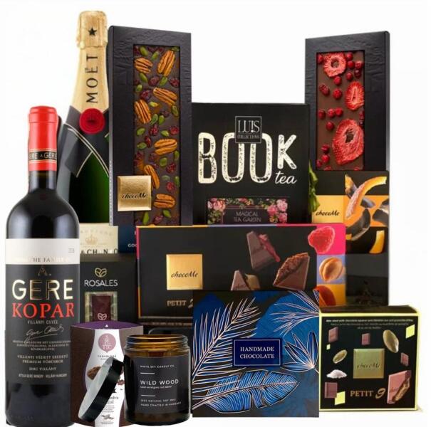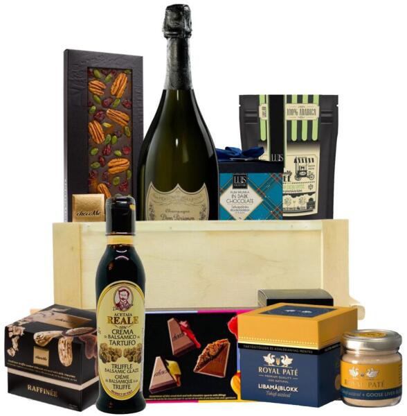 Don Perignon: Patinás palackban a borvilág egyik legnagyobb klasszikusa. Kéz műves pisztáciás csokoládé: Gondosan kézzel készített dióval, pisztáciával és liofilizált gyümölcs darabokkal szórt csokoládé, nem csak szemet gyönyörködtető, de mennyei finom is. Szilvapálinka étcsokoládéban: Folyékony szilva pálinkával töltött étcsokoládé golyók. Bármely alkalomra