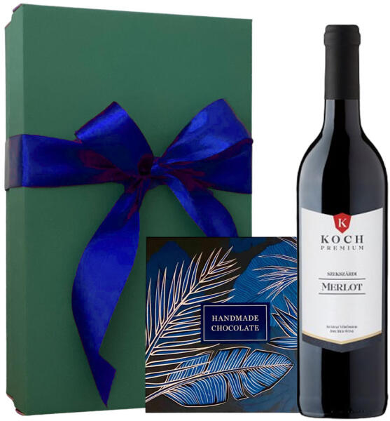 Kézműves Csokoládé Koch Merlot: A szekszárdi borvidék kiváló minőségét adó fajta. Kézzel szüretelt és válogatott, tölgyfahordóban érlelt bársonyos vörösbora található ebben az elegáns palackban. Száraz vörösbor. Ajándékdoboz: