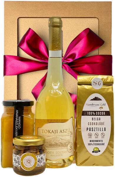 Tokaji Aszú 3 puttonyos: Tóth Zoltán Pincészetéből. A Tokaji Aszú évszázados receptúra alapján, tölgyfahordós érleléssel készül. Különleges minőségű magyar desszertbor, amely gasztronómiai kiegészítés nélkül is, megállja a helyét. Termelői diós akácméz: Igazán különleges és jó párosítás a dió és a méz kombinációja. Teába, forró italokba, palacsintá