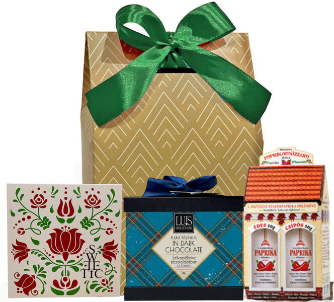 Étcsokoládé pálinkás aszaltmeggyel: 73%-os étcsokoládé pálinkás aszaltmeggyel magyaros csomagolásban. Paprikamúzeum, csípős paprika őrlemény: Első osztályú csípős paprika őrlemény Kalocsáról. Szilvapálinka étcsokoládéban: Folyékony szilva pálinkával töltött étcsokoládé golyók. Bármely alkalomra nagyszerű ajándék. Sátortetős doboz A doboz mérete:15x9x15