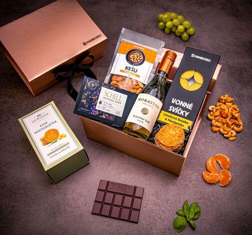 Giftboxeo ajándékdoboz (rózsaarany) - A borásznak, fehérbor ajándékozzon úgy, mint a bor! A Giftboxeo ajándékcsomagunk tökéletes ajándék a fehérborok iránt vonzódó borivónak. A születésnapos a kedvenc itala mellett olyan finomságokat is talál benne...