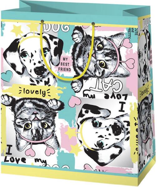 Háziállatos közepes méretű ajándéktáska 18x23x10cm-es Hivatalos magyarországi forgalmazótól. Leírás: Hozza meg a háziállatok szeretetét ajándékával ezzel a közepes méretű ajándéktáskával! A táska felületén játékos kutya és cica figurák láthatók, amelyek bármilyen alkalomra ideálissá teszik, különösen állatbarátok számára. A 18x23x10 cm-es táska nem csa
