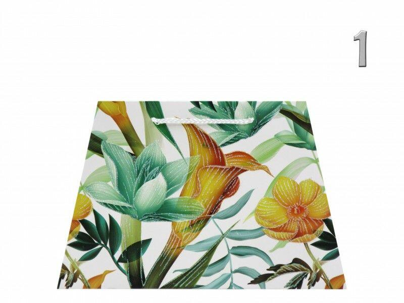 Ajándéktasak fekvő virágos glitteres közép 29,5x12x19cm 4féle 02762 4 féle típus választhatóDísztasak MBefoglaló méretek 29.5x12x19 cmAnyaga papír