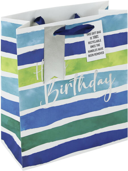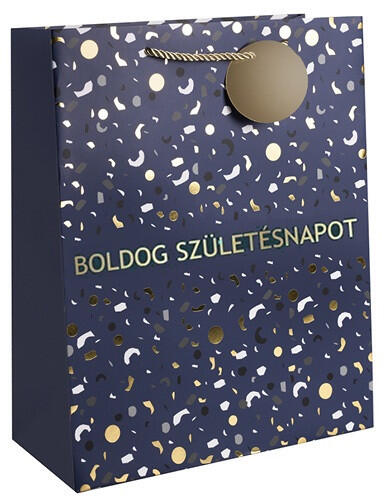 Dísztasak matt 18x23 cm kék/arany Boldog születésnapot felirattal " M " méretű dísztasak anyag: 157 g/ m2 súlyú papír formátum: álló felület: matt fogantyú: zsinórfül