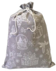 Textil Karácsonyi ajándék tasak szürke alapon karácsonyi motívumokkal. Édességgel, gyümölccsel, apró ajándékkal tölthetünk meg Mikulás napján, illetve csomagolhatunk bele ajándékot karácsonykor. Uzsonnás tasakként akár ünnepek után is hasznosítható! Egy rétegű, nem bélelt, 100% pamut alapanyagból készült, húzózsinórral záródó textil zsák. Méret: szélesség