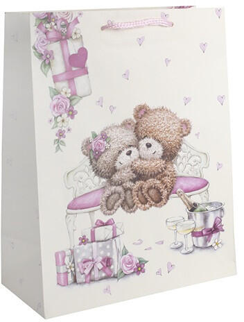 Dísztasak matt 18x23 cm macipár " M " méretű dísztasak anyag: 210 g/m2 súlyú papír formátum: álló felület: matt fogantyú: szalagfül