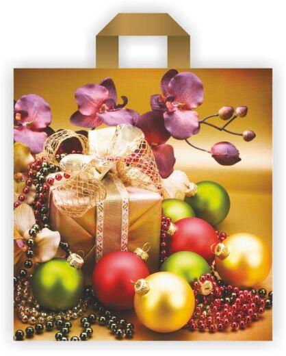 Szalagfüles táska. Vastag, fényes anyagból készült, elegáns megjelenésű, karácsonyi mintával. Mérete: 400 x 420 x 0,05 mm (szélesség x hosszúság x vastagság) A legkisebb választható mennyiség: 25 db, 100 db-os kiszerelés esetén kedvezőbb az ára.