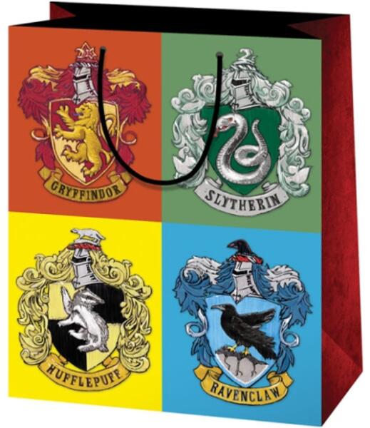 Harry Potter Roxforti házak közepes méretű ajándéktáska 18x23x10cm-es Hivatalos magyarországi forgalmazótól. Leírás: A Harry Potter rajongók biztosan remekül ismerik a Roxforti házakat. Ezen a csodaszép ajándéktáskán a Griffendél, Hugrabug, Hollohát és Mardekár házak címerei láthatóak. A Cardex kiváló minőségű ajándéktáskái erős zsinór fülekkel és erősíte