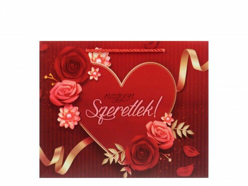Ajándéktasak fekvő Nagyon szeretlek szíves rózsás nagy 32x12,5x26 02125 Dísztasak LBefoglaló méretek 32x12.5x26 cmAnyaga papír