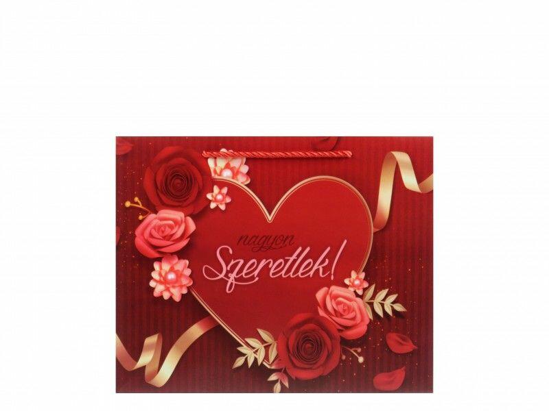 Ajándéktasak fekvő Nagyon szeretlek szíves rózsás közép 23x10x18cm 02124 Befoglaló méretek 23x10x18 cmDísztasak MAnyaga papír