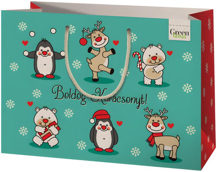 Green Grass - Boldog Karácsonyt! aranyos állatos közepes méretű ajándéktáska 18x10x23cm Hivatalos magyarországi forgalmazótól. Leírás: Ez egy igazán hangulatos karácsonyi ajándéktáska, amely garantáltan mosolyt csal az ajándékát átvevő arcára. A "Boldog Karácsonyt!" felirat a csomagolásban rejlő ünnepi hangulatot tovább erősíti. Az állatos design, melyen pingvin, r