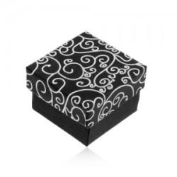 Doboz gyűrűre, medálra vagy fülbevalóra. A doboz teteje fekete színű, fehér, tekert minták lenyomatával, míg az alsó rész fekete színű. A belsejében egy fekete párna található, bemetszésekkel az ékszerre. Alkalmas gyűrűre, medálra vagy fülbevalóra. Méretek: 45 x 45 x 30 mmBelső méretek: 40 x 40 mm