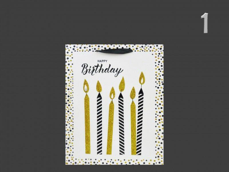 Ajándéktasak Happy Birthday fekete/fehér/arany közép 18x8x23cm 4féle 02879 4 féle típus választhatóDísztasak MBefoglaló méretek 18x8x23 cmAnyaga papír