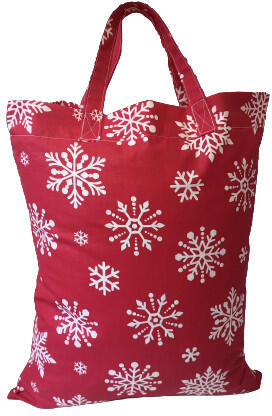 Piros alapon hópehely mintás pamut Karácsonyi ajándék táska rövid füllel. Magyar készítésű, minőségi pamutvászonból készült, egyedi vászon szatyor. Praktikus, környezetbarát, választás a mindennapi bevásárláshoz, ajándékok átadásához. Többször használható, mosható. Szabásból adódóan a minta elhelyezkedése eltérhet kissé a képen látottaktól. Egy réteg